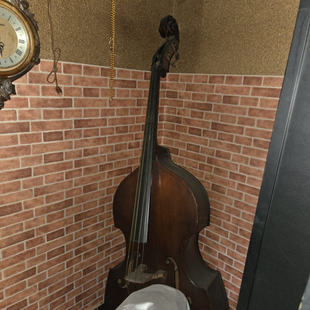 コントラバス。こんな物を置いてあること自体が、当時の高級店を物語っています。