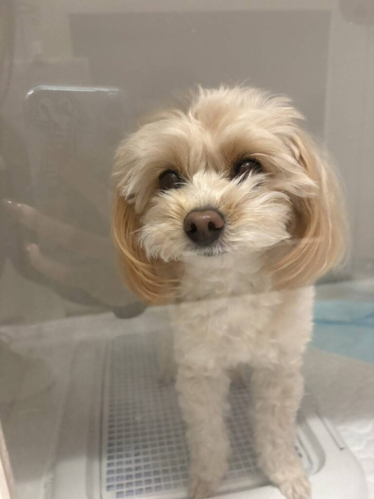 ペットホテルの方から送られてきた写真が、『いつ迎えに来てくれるの?』って顔しているように見えます。
